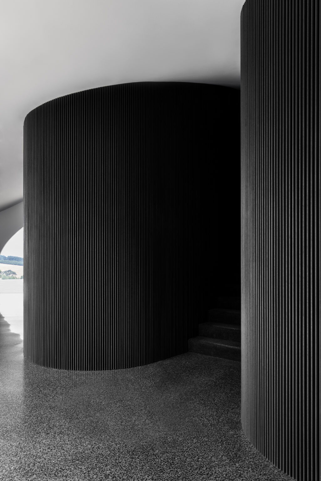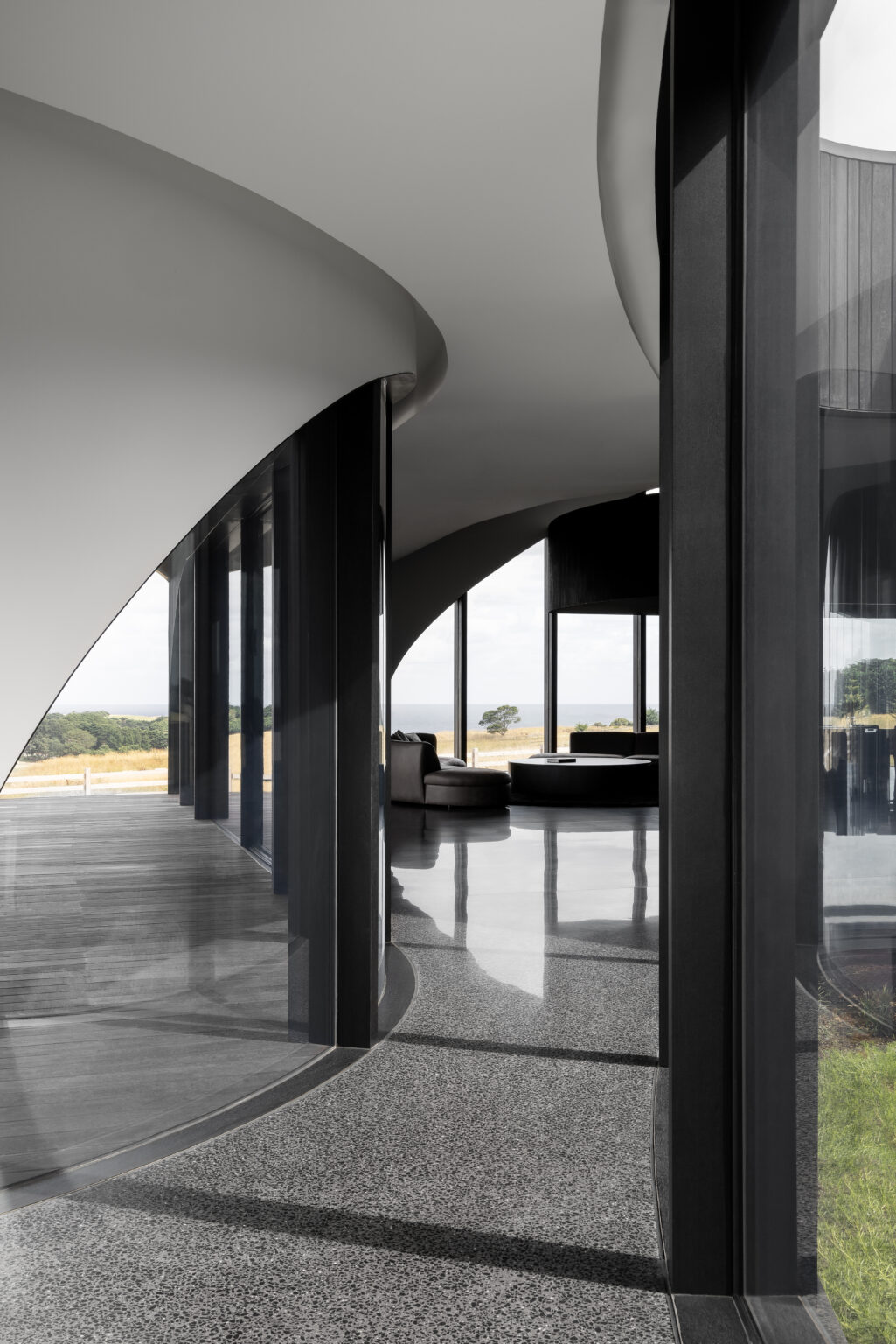 The double-height living space offers an expansive view of both the delightfully sparse rural terrain and calming ocean; with a sweeping parabolic ceiling that supposedly provides unique acoustic quality โ something to accommodate the ownerโs grand piano and other instruments.