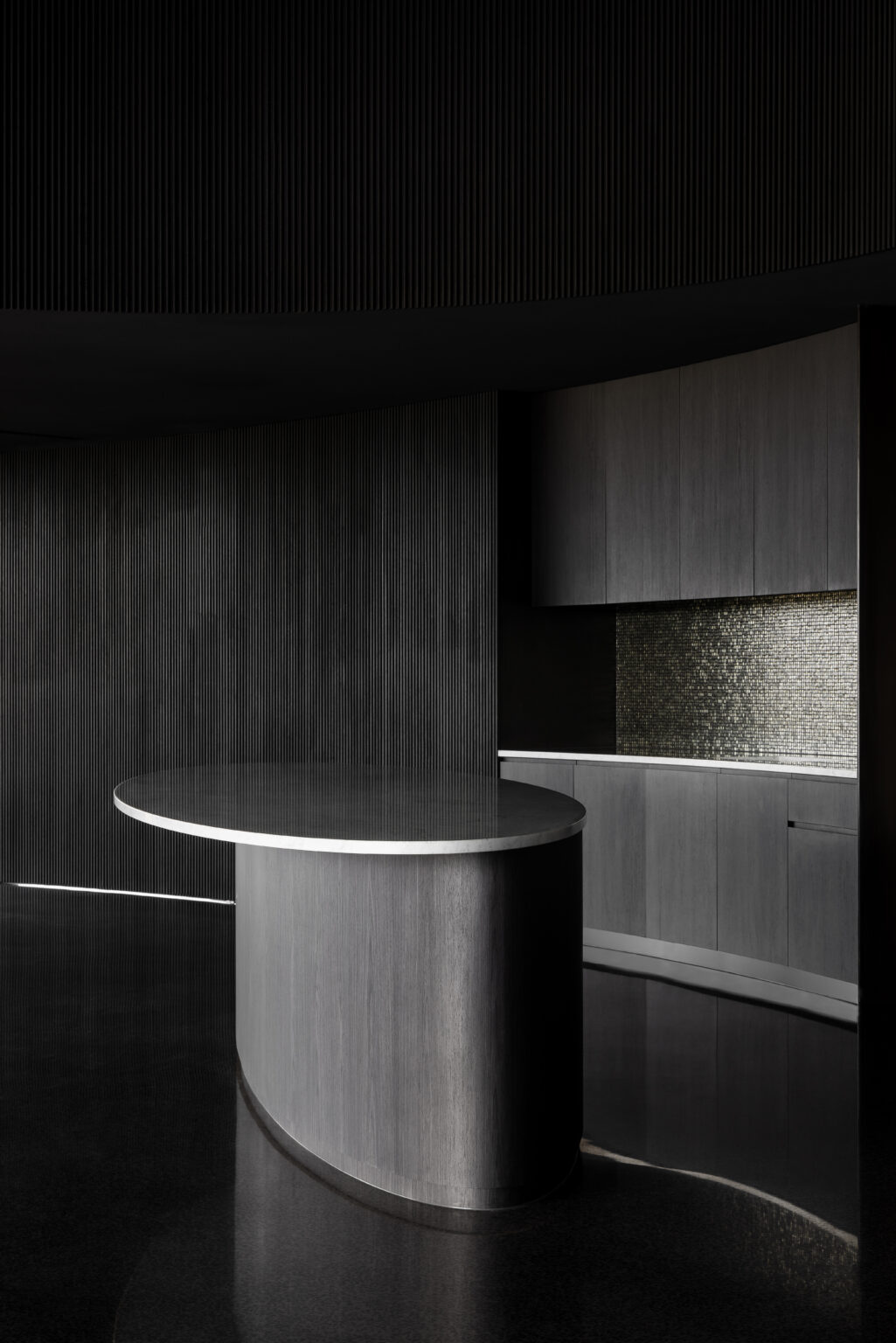 Given the minimal glazing and considerable thermal mass, the elevation stabilises the heat collected from the afternoon sun. On the subject of functionality, the charred timber and rammed earth that shrouds Peninsula House have been selected for their robust and low-maintenance qualities.
