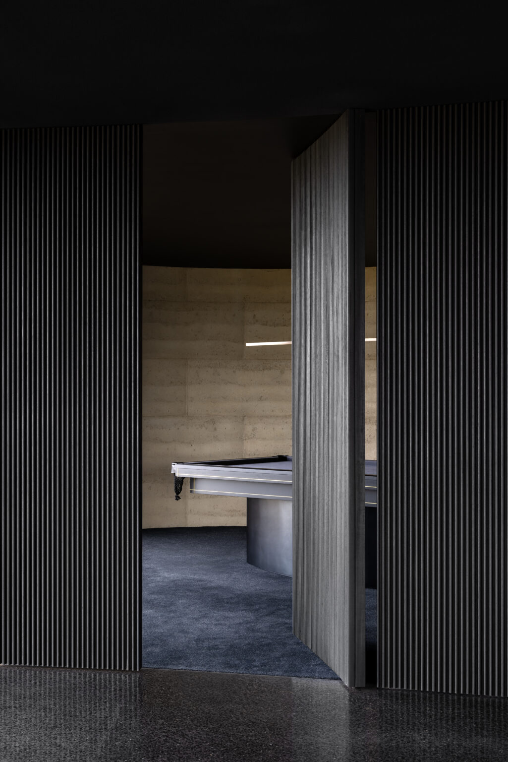 Accessible via a meandering driveway, the main structure resembles a ribbon of rammed earth that crests upwards to as high as 10 metres into the air; wrapping behind the dwelling before gradually tapering into the landscape. And thereโs an actual function to the form.
