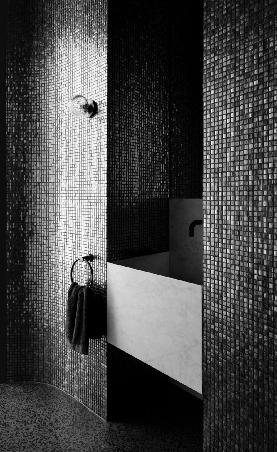 Crossing the threshold, youโll encounter plenty of black mosaic tiles, black timber battens, blackened brass, and black terrazzo flooring, but most prominently (and immediately): a lush, planted atrium that โdefines the buildingโs axial centre.โ