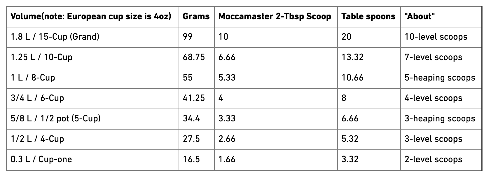This Moccamaster chart offers quick measurements to make things easy: