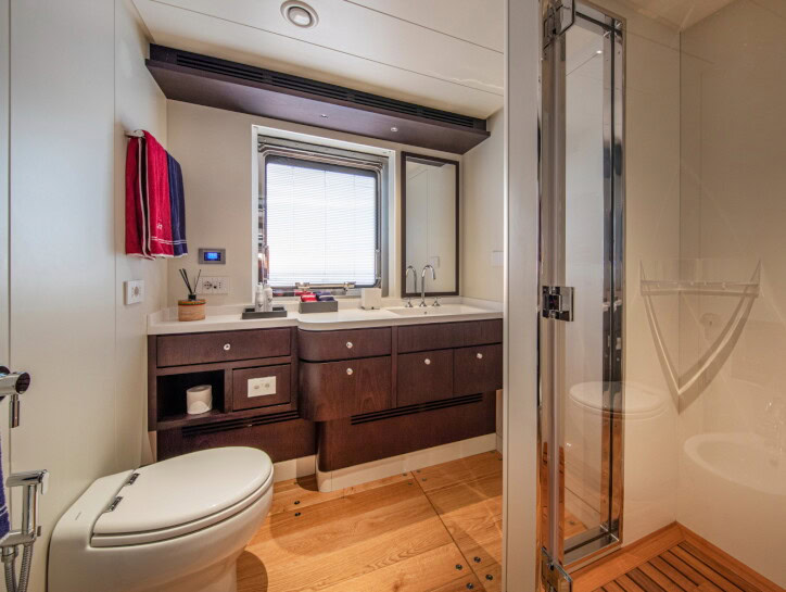 There are two double cabins on the main deck with opening doors to the deck. The lower deck comprises a double cabin and a convertible twin cabin with fold-down balconies. Above the bridge deck is the owner’s deck, which comes with his ‘n’ her bathrooms, a large lounge that can be converted to an extra double bed, as well as access to an open aft deck with its private Jacuzzi and walkaround decks.