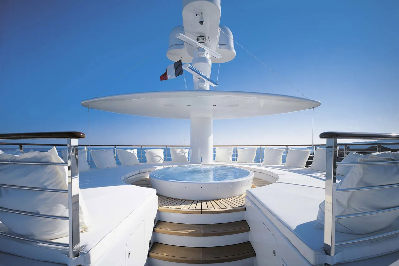 โWedge Tooโ can accommodate 12 guests and features a complete ownerโs deck, three VIP guest cabins, four guest staterooms, and facilities for up to twenty support staff. The cherry on top of this boat is actually the circular hot tub lounge area that you wouldnโt even know exists from water level to ensure maximum privacy. Reminiscent of a classic ocean linerโs โbirdโs nestโ, it could be the best vantage point on the whole vessel to enjoy sweeping vistas of St Barts or the Monaco Grand Prix.