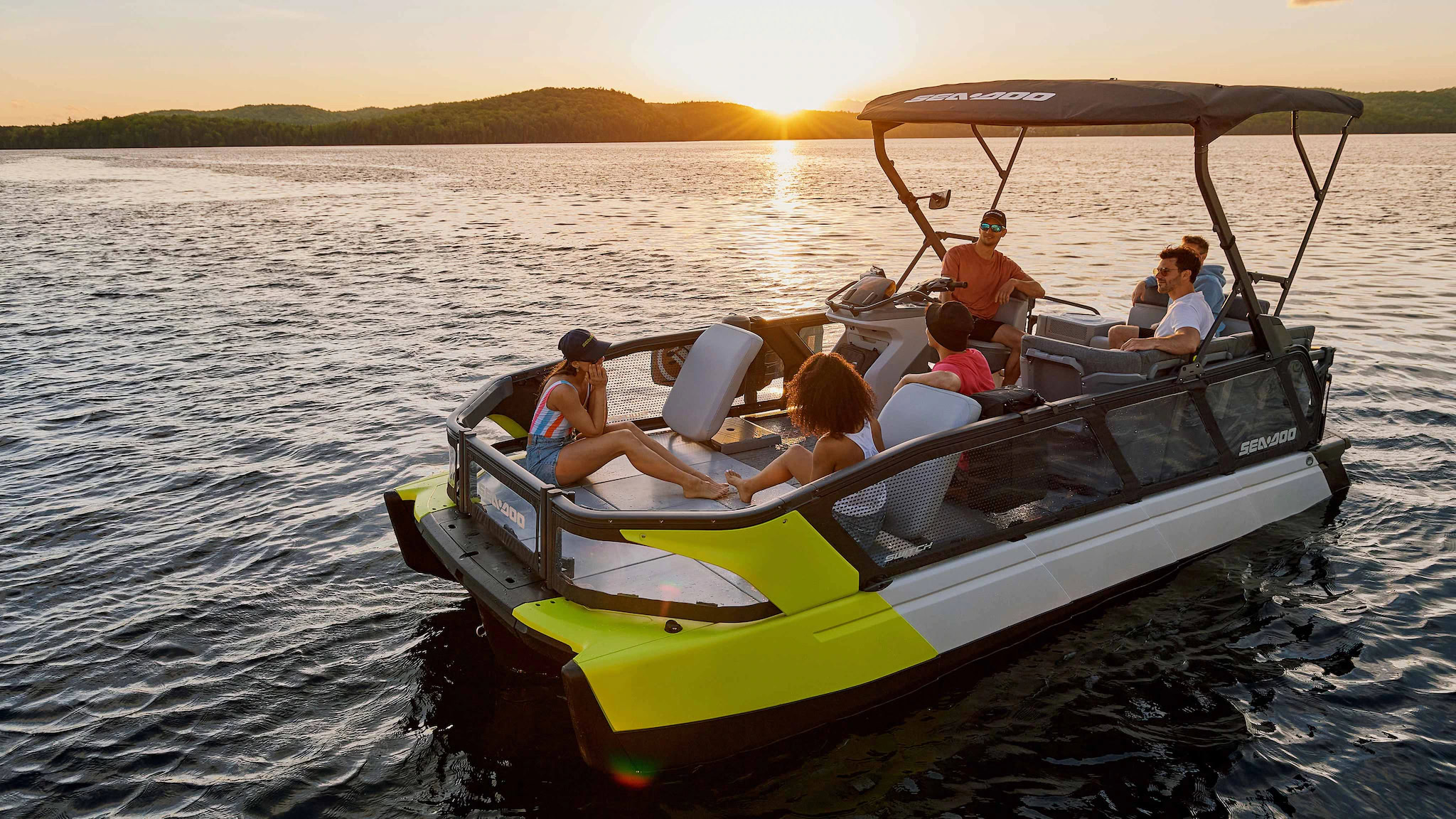 Using the LinQ modular hardware produced by Sea-Dooโs parent company BRP, almost any piece of the deck can be removed and clicked back into place somewhere else. That includes benches and single seats, tables, as well as swimming platforms โ all of which you can rearrange during a day out on the water.