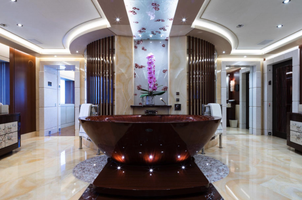 Arranged by Camper & Nicholsons, Tranquility can comfortably accommodate up to 18 guests across 9 cabins. The interiors were conceived by Andrew Winch Designs Ltd and are championed by the massive master bedroom that boasts 180-degree views and a freestanding marble bathtub.