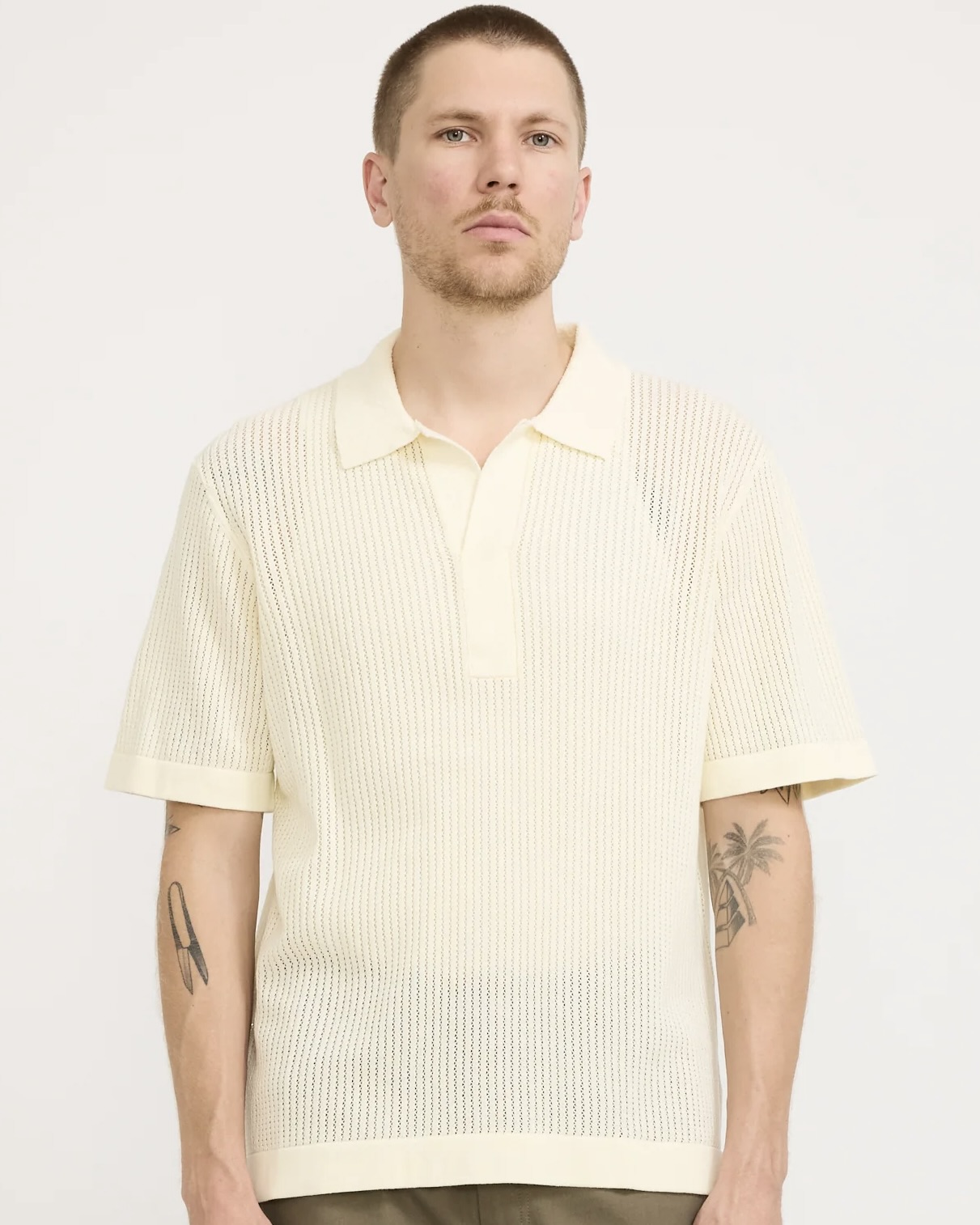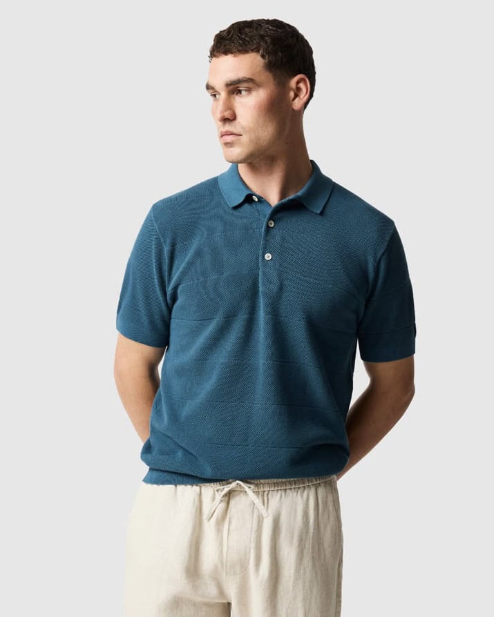 Designs like the Huxley knitted polo exemplify why. Made using 94% organic cotton, this shirt features an open weave that looks best layered over a singlet and makes it perfect for a day at the beach.