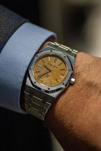 The โSalmon dialโ, as it was aptly named at SIHH 2019, receives matching white gold hands and indices and houses APโs Cal. 2121 with a 40-hour power reserve. Under different light, the dial appears to morph from yellow to brown and towards a subtle goldy pink hue. Itโs a beauty to observe and even nicer to wear, gracing the wrist with a wonderful weight, without being at all ostentatious like itโs yellow gold cousin.