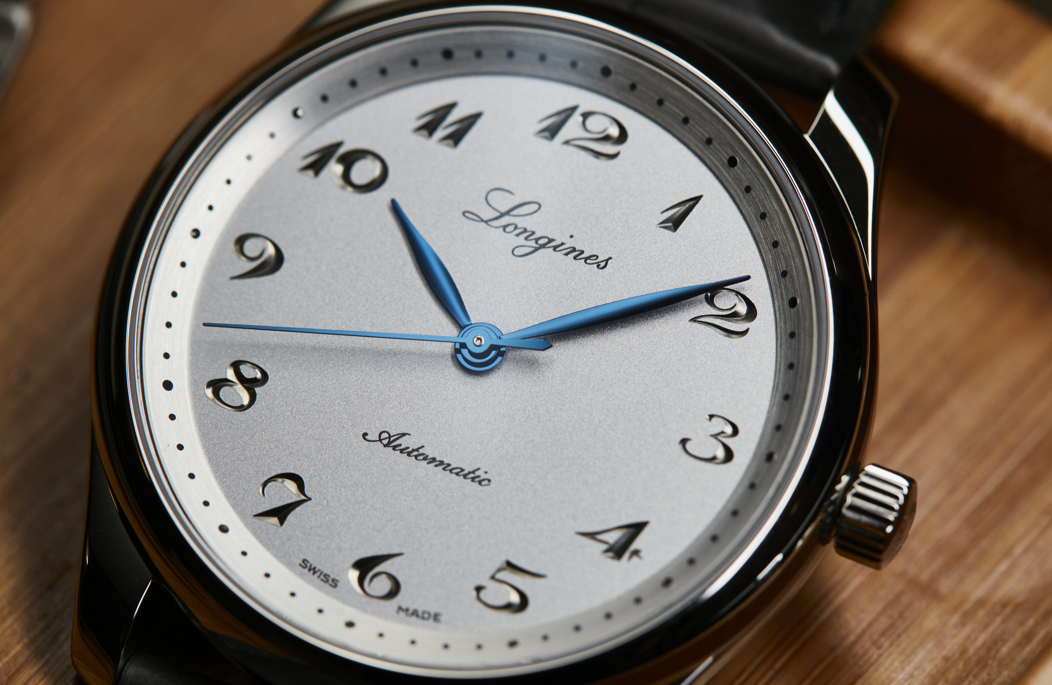 The dials are the real star of the show, however, all of which feature a historical Longines logo in pride of place at 12 o’clock. The reference in stainless steel features a silvered dial with a lightly sandblasted texture, black engraved Arabic numerals and wonderfully blued steel hands, all of which are framed by a concentrically brushed minute track that has also been engraved. Top drawer stuff.