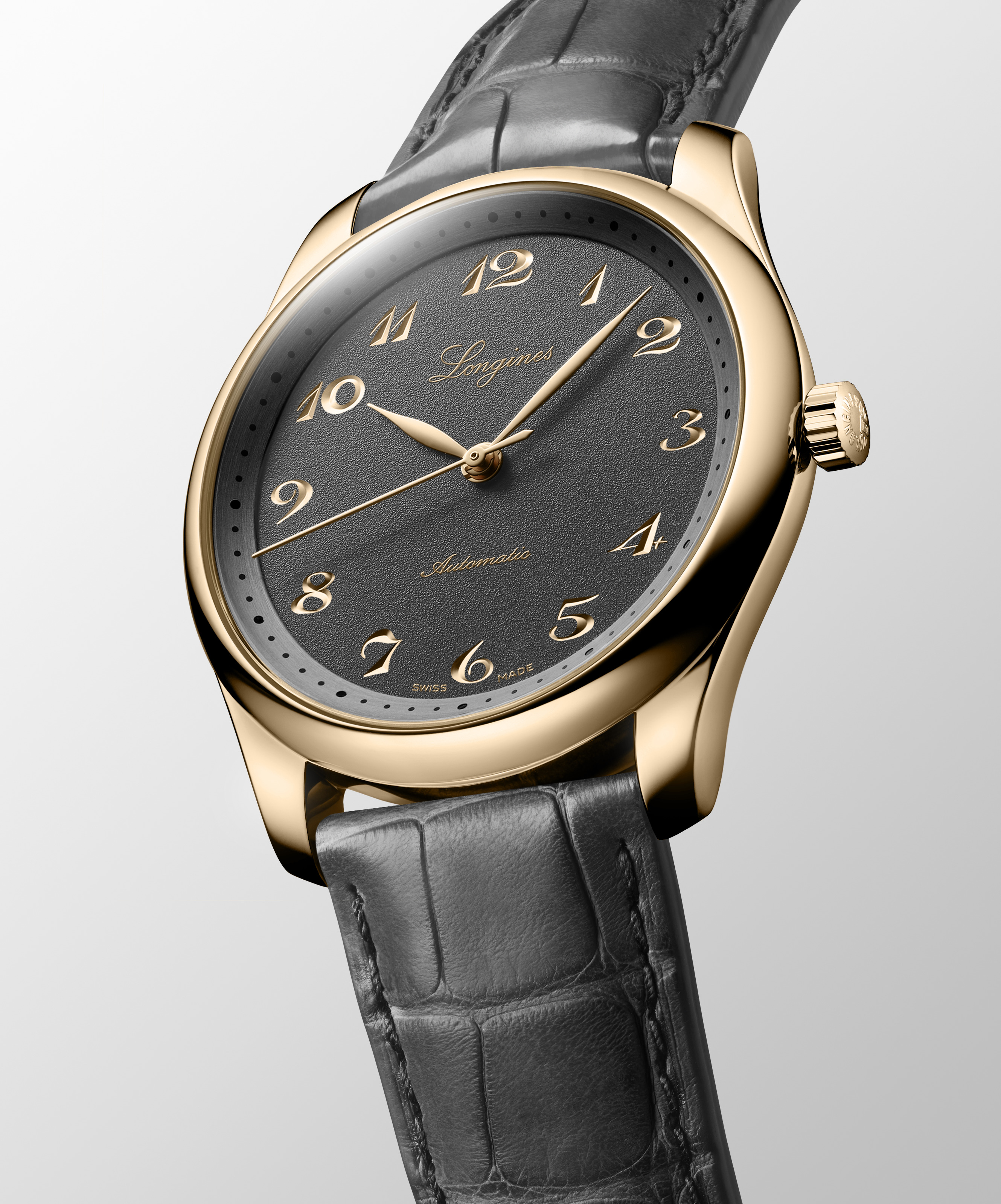 Appropriate for a traditionally executed collection of timepieces, all three watches arrive on an anthracite alligator strap with what Longines describes as a “soft touch” feeling. The stainless steel reference is secured with a button-actuated folding clasp, while the two gold versions can be strapped to your wrist with a gold buckle to match their respective alloys.