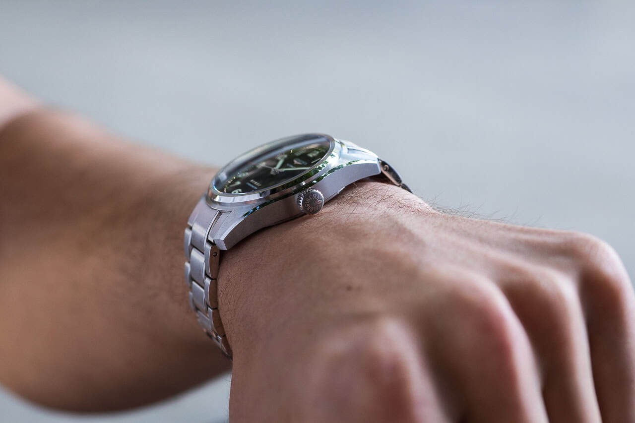 The restrained steel case utilises brushed and polished finishes to highlight the bezel and distinct chamfers that extend, uninterrupted, from lug to lug. From above, the watch looks slightly elongated due to the length of the lugs, which curve nicely over the wrist. Despite the link to aviation โ with an oversized crown for adjusting the time while wearing gloves โ thereโs a military aesthetic and utilitarian approach to the design.