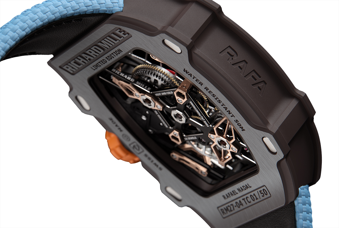 Thanks to this unusual method of supporting the movement in the case, the Richard Mille RM 27-04 is able to stand up to 12,000 Gโs of force, or enough to handle the frightening velocity of Rafaโs serve without causing the movement to malfunction.
