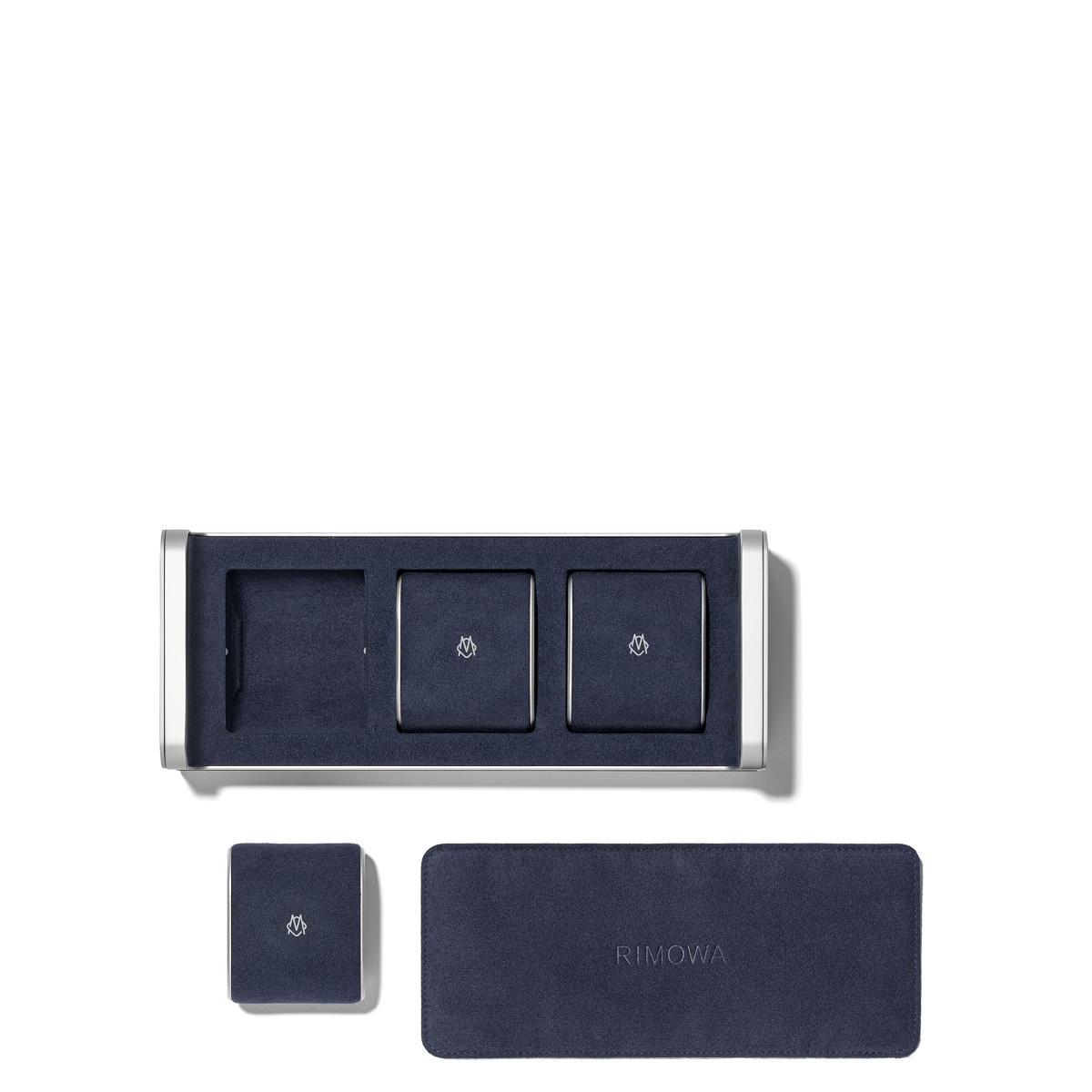 Made in Italy, the case sticks closely to RIMOWAโs long-established design language, keeping it minimal with an engineered grooved aluminium exterior shell and a microfibre interior lining with three removable cushions, finished in a plush dark blue hue that could make any timepiece pop, whether itโs a quartz Tag Heuer, elegant Longines, or timeless Tissot. Whatever the chronometer, itโll be well protected given thereโs also a cushioned top piece, included for extra padding impervious to any bumps or scuffs to both the timepiece and watch face.