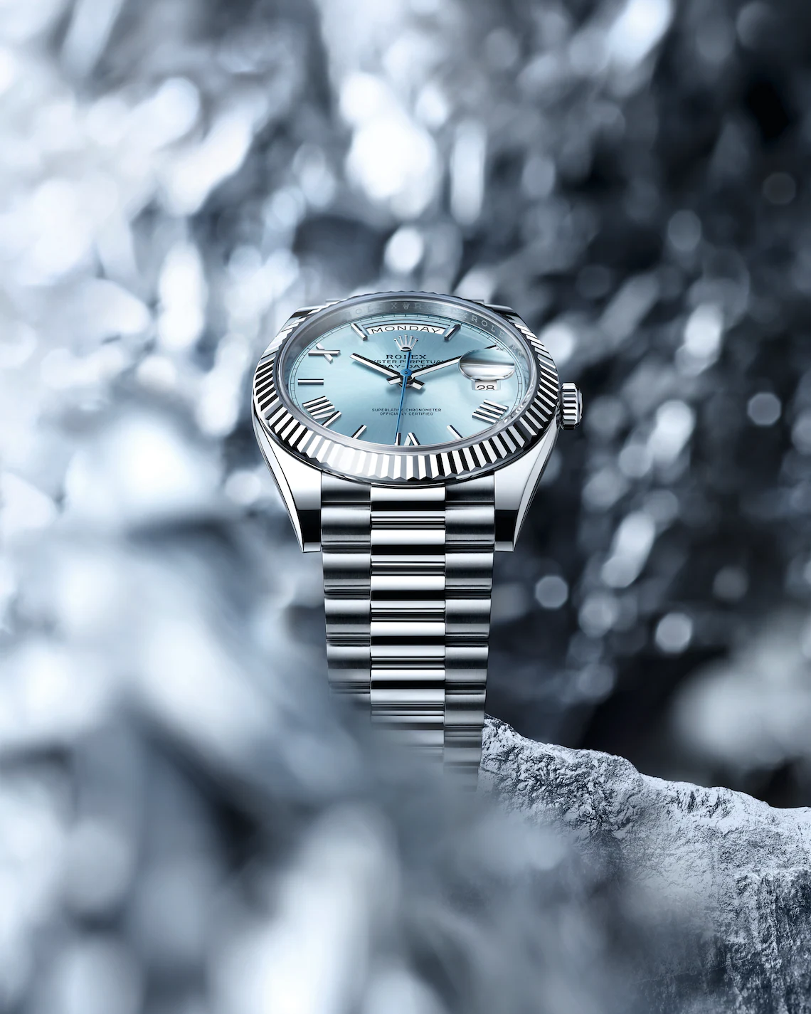 The bezel isnโt the only place youโll find those glinting facets though, with the dial of the 40mm Day-Date boasting a set of Roman numeral hour markers that have been constructed with the same hard angles. As always with platinum watches from Rolex, the dial is icy blue, with a light blued seconds hand and a date window highlighted by the cyclops magnifier in the sapphire crystal covering the dial.