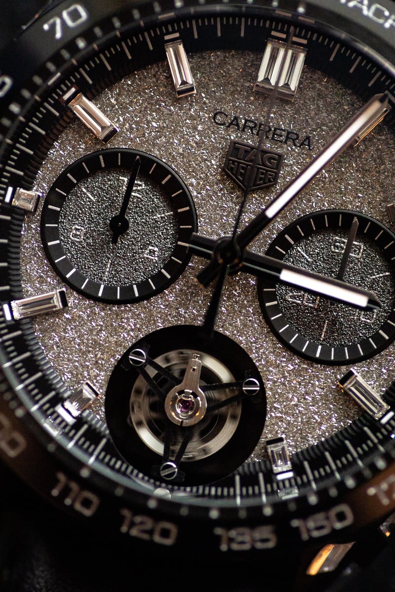Synthetic diamonds are, of course, not a novel occurrence. Typically associated with the jewellery industry, they are decidedly rarer inside the context of watchmaking. Yet more interesting still is the manner in which TAG have incorporated them into this new Carrera: shards of ice are inlaid all across the 44mm case’s lateral surfaces, while each chronograph register is decorated using a polycrystalline diamond (attached to its parent surface using a brass base).