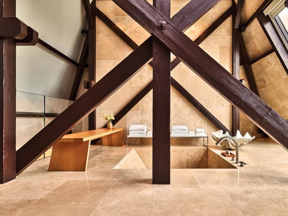 Never mind that the suite comes with a professional-quality sound system and even an acoustic guitar, nodding to the propertyโs past as a music school. Itโs the two captivating Jerusalem sandstone bathrooms that get all the attention, with super-sized showers, luxury bathroom amenities, and marble tubs, broken up by Oregon pine and dramatic hemlock beams.