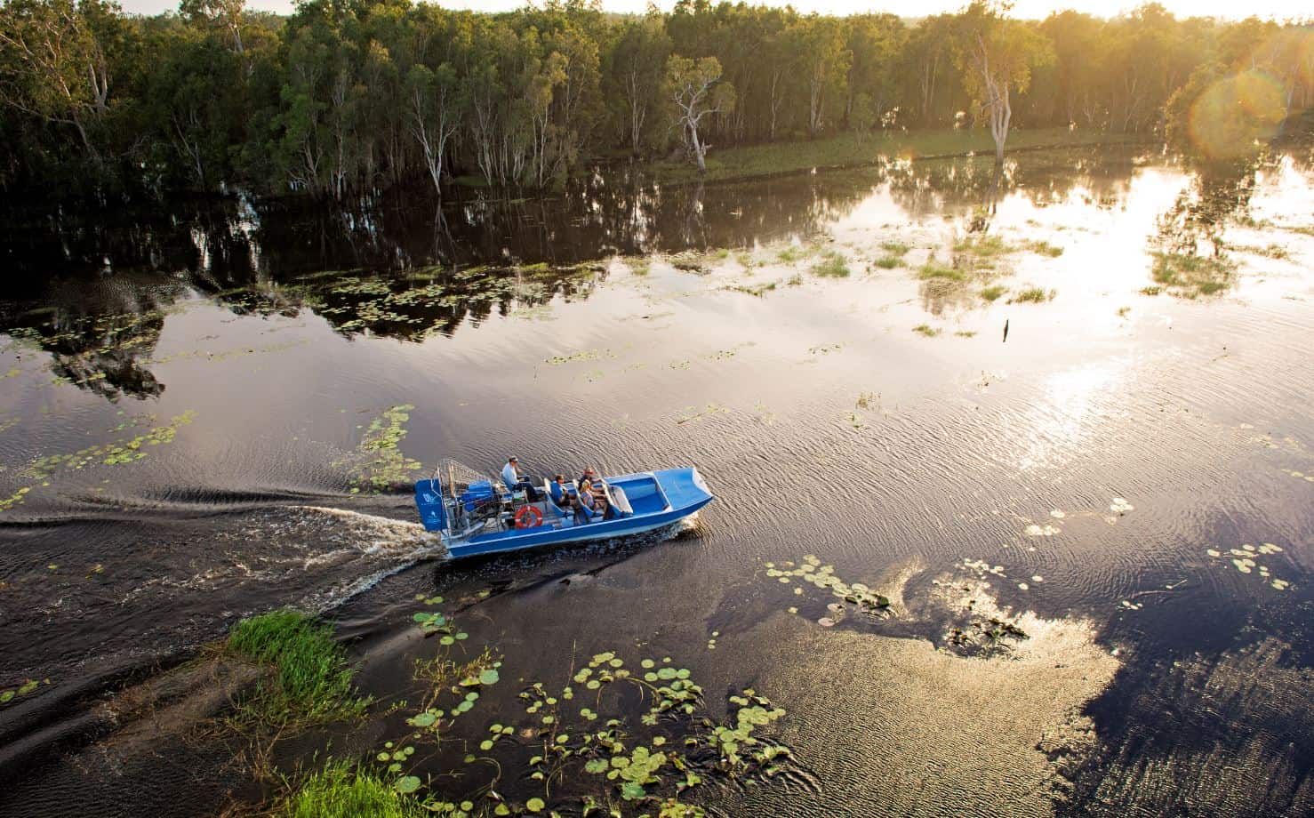 The trophy experience at Wildman is a brisk airboat safari trailing the dramatic waters of Mary River Westlands. This area claims the worldโs highest density of crocodiles โ both saltwater and freshwater โ so it wouldnโt exactly be unusual to see more than a few toothy grins snapping above the surface, as herds of water buffalo wade the waters and magpie geese go about their business.