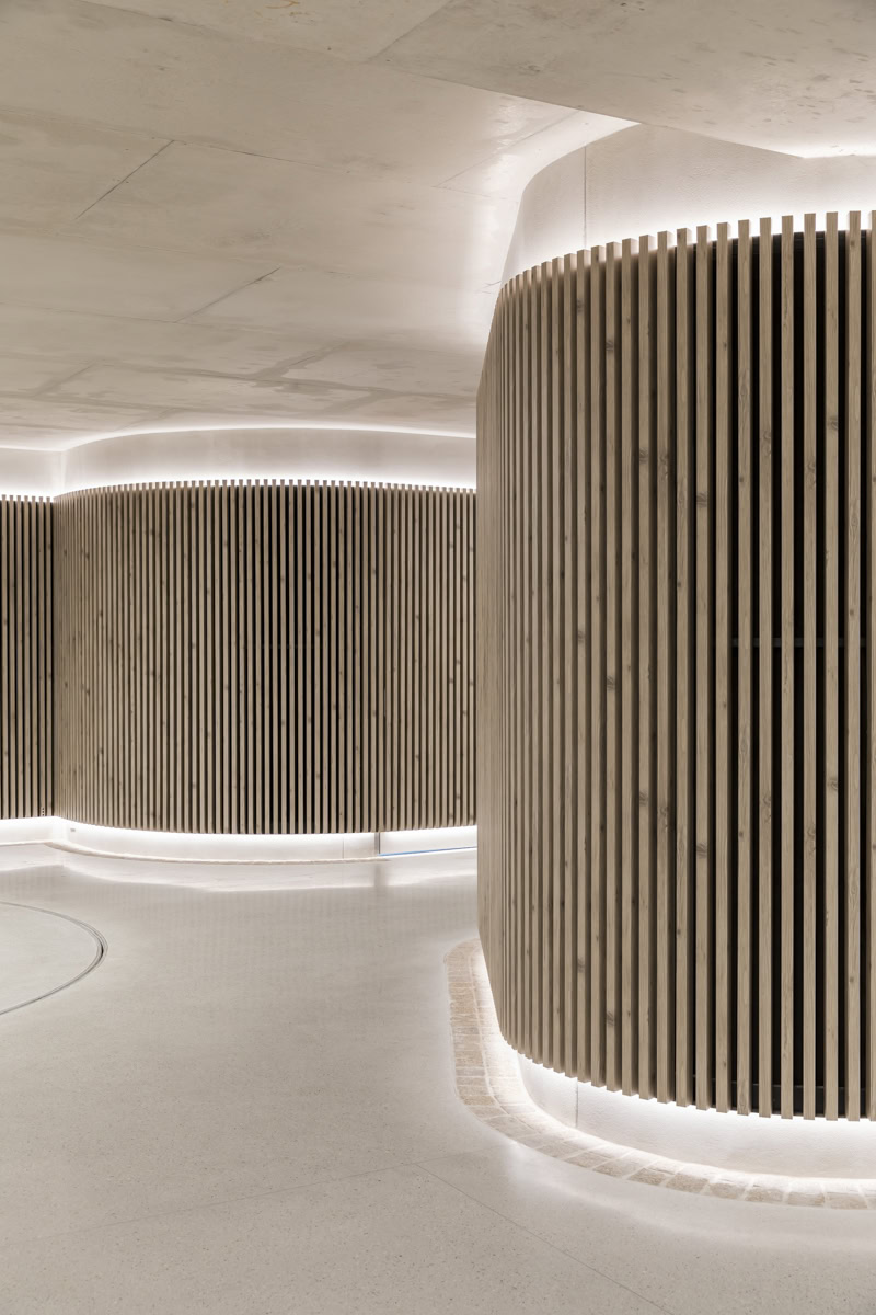 Kent ditched the reflective, glossy surfaces of traditional showrooms and selected LED strip lights to be fitted behind the wall battens at the skirting, to provide a soft glow throughout the entire space. The lighting design highlights the curvature of the walls and lines of the battens, ridding the entire area of its former industrial atmosphere.