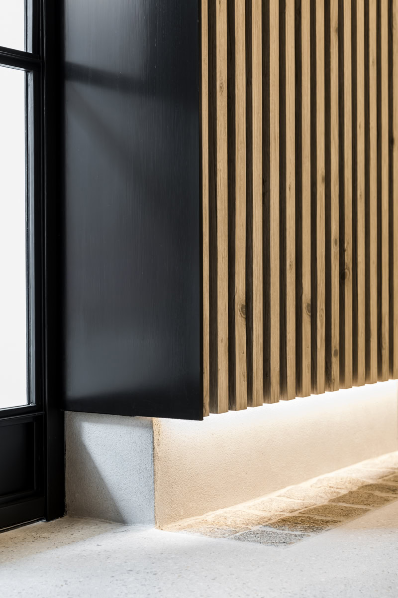 Kent aimed for a warm and calming atmosphere that would transition well to the rich, traditional detailing inside the house. While softening the harshness of dark walls with wooden battens is a relatively routine procedure for Kent, at one point, she was worried that utilising organic materials underground would provoke mould, given the space is deprived of natural light.