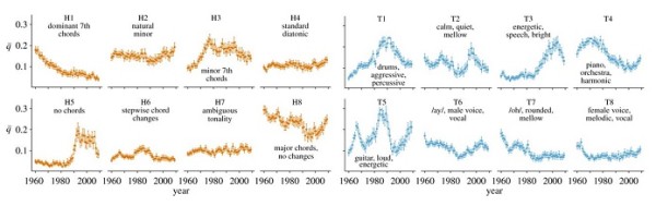 In their 2015 study, Leroi and his colleagues analysed the sound evolution of US pop songs from the 60s to 2010. With the use of audio processing software, they tracked changing patterns of chord sequences, placing them in general harmonic categories.