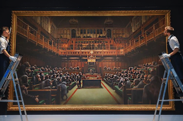 The work depicts the British Parliament being run by chimpanzees, Banksyโs not so subtle jab at the intelligence of those in the House of Commons. First displayed at an exhibition in Banksyโs hometown of Bristol over a decade ago, the talented artist reworked the piece before selling it to an unnamed buyer in 2011.