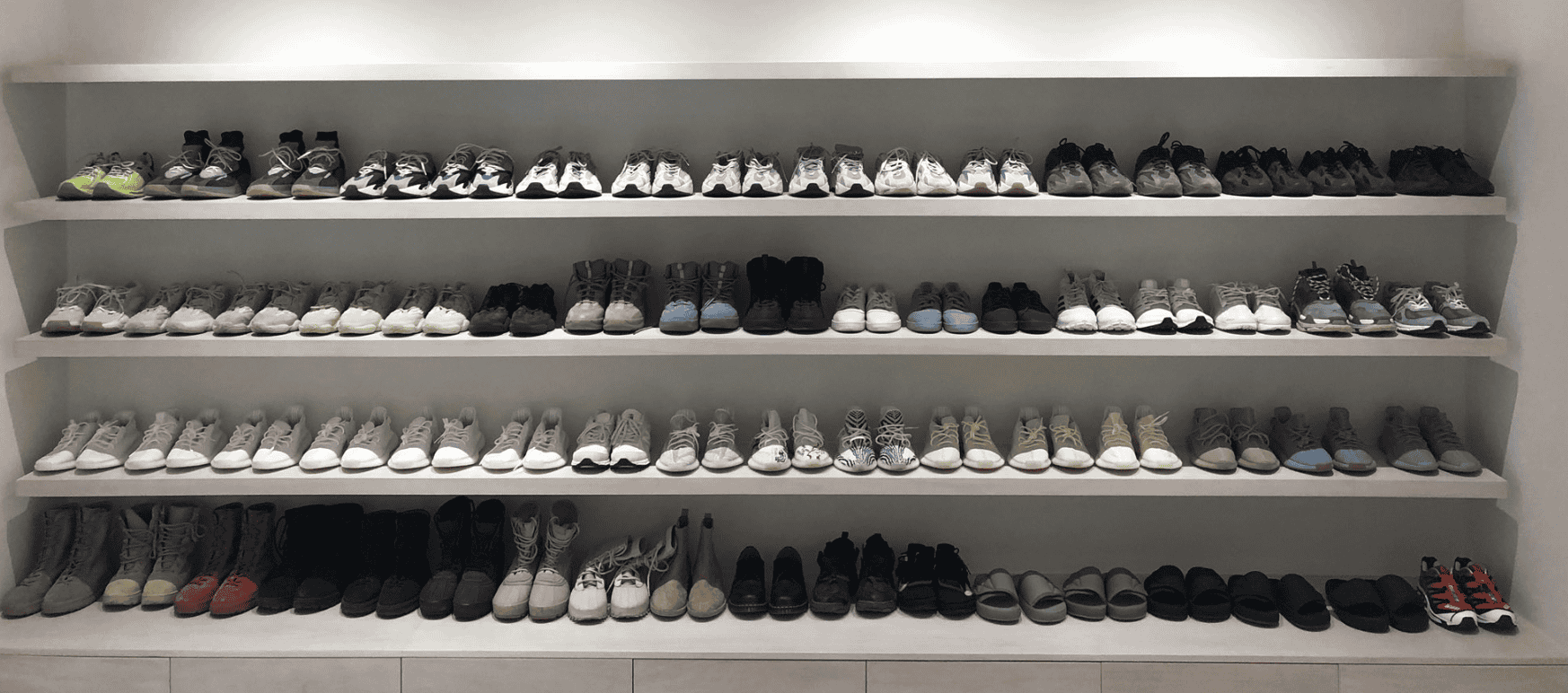 As you can see from the image above, the man runs a tight operation keeping his shoes in a semi-colour coded order and he even stocks a lot of his own designs. Along with showing off his very own stockpile of Yeezys, keen sneakerheads have pointed out a number of other hard to find kicks in his collection, including a pair of Kiko Kostadinov ASICS, some Balenciaga Triple S Off Whites and multiple New Balances.