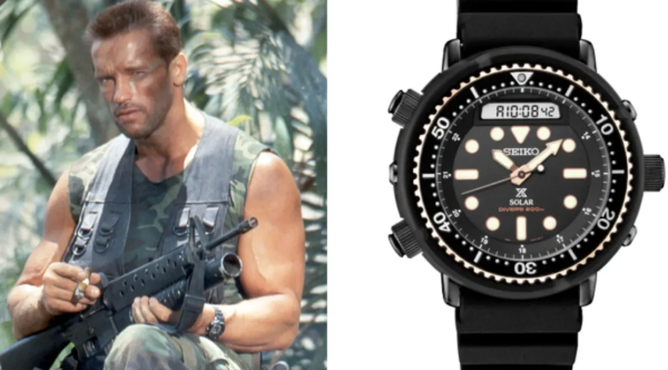 The bulky no-nonsense timepiece was worn by Schwarzenegger in both Predator and Commando and was the first dive watch to feature a digital alarm chronograph with an analogue display. It subsequently became one of Seikoโ€™s biggest sellers and quickly earned the nickname โ€œthe Arnieโ€ amongst fans.