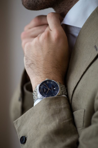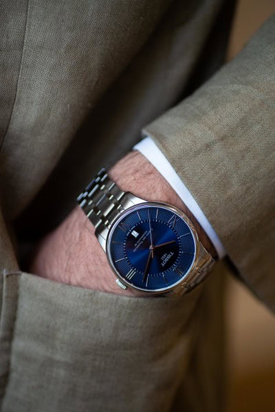 On a steel bracelet, the Tissot Chemin Des Tourelles Powermatic 80 handles the sweat while its 42mm case complements wide jacket lapels. A striking textured navy blue dial with fitting Roman numerals pops against the beige or olive coloured jacket, slipping gracefully into a patch pocket or under a relaxed button-up cuff.