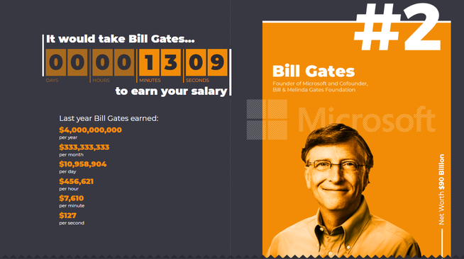For the morbidly curious, thereโs now a nifty little calculator to tell you how long itโd take the worldโs leading billionaires to make your annual salary. Simply enter your yearly take-home, and find out the minutes/hours/days itโd take such names as Jeff Bezos, Bill Gates, Warren Buffet, and several more to make that.