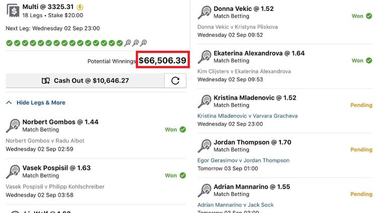 In a tale as old as time itself, a man has come inches from glory on the punt. Having lined up an 18-leg multi last week, the potential payout for his $20 bet was $66,000 โ and it was one which almost came into fruition. Until a single leg fell through when world number thirty-nine French tennis star โ Kristina Mladenovic โ lost her match against Varvara Gracheva in a historic choke for the former/historic comeback for the latter.
