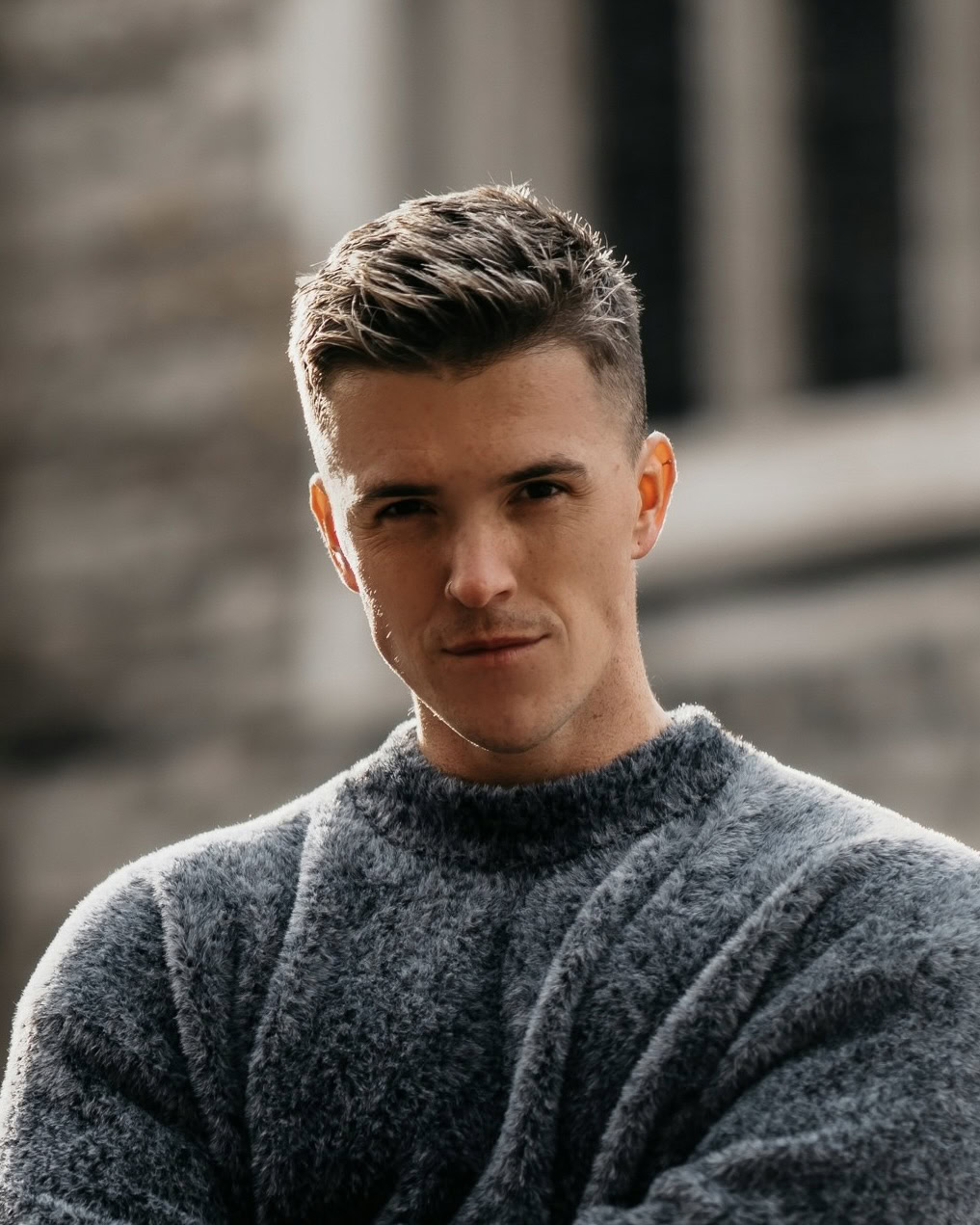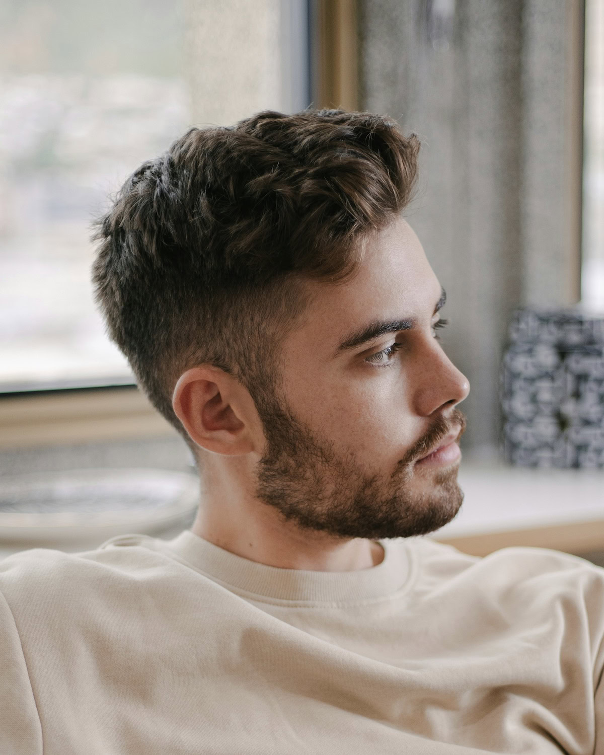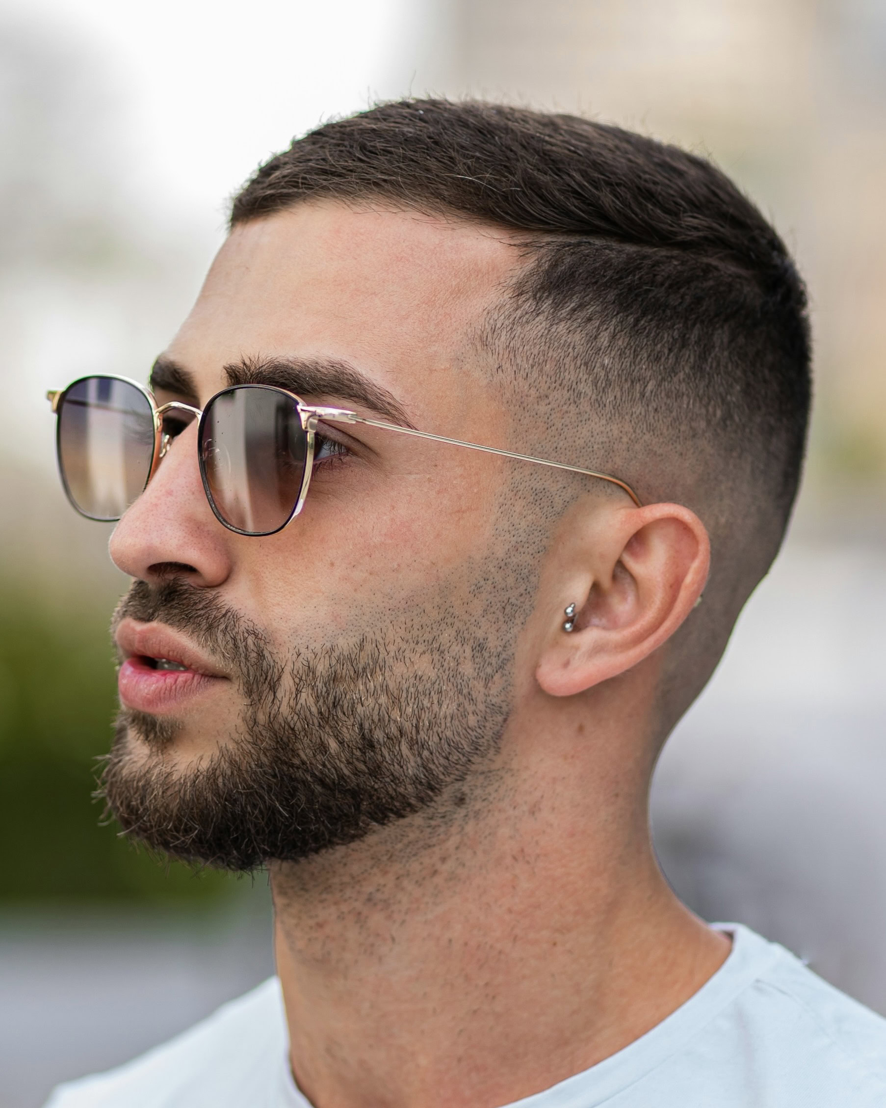 A casual run-through of the fingers with some product should do the trick; tapered sides are essential, especially if you’re playing around with blending facial hair with your short haircut.