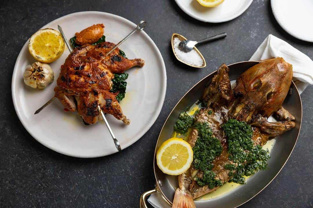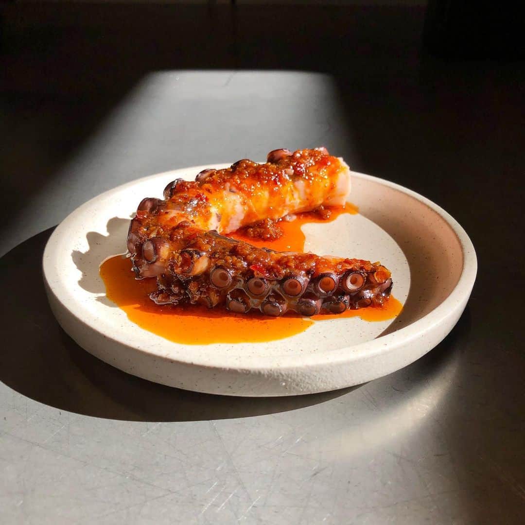 The interesting take on โnew Koreanโ includes dishes like the spring onion pancake with mozzarella and crunchy chilli oil, and gochujang charred octopus with garlic chives, shallot namul and cashew. Whatever you order, itโll definitely be hard to avoid the grilled spiced lamb chops with mushroom ketchup and pickled radish.