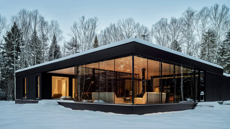 Situated on a 250,000-square-foot plot of forested land, the home is the perfect antidote to the relentless pace of city living, thanks to its floor-to-ceiling glass walls and an interior courtyard that invites the natural surroundings of the property inside. Its visual impact is unquestionable, cutting a stark all-black figure that contrasts the dense boreal forests of coniferous and hardwood trees that call this part of Canada home.