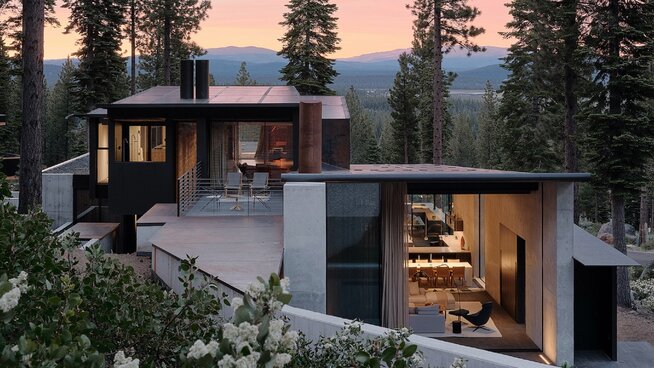 Influenced by its location, youโll find references to the mountainside geography within the Lookout House design. Not just allusions to the most obvious geological formation, either; although there is red-orange glass present to emulate cooling magma. Concrete walls made from local sand, heated stone floors, wood ceilings to match the forest of pines and white firs โ the concrete + black steel exterior is even fire resistant and โlow maintenanceโ.