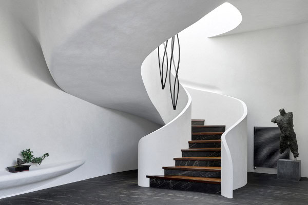 The home features curved walls and ceilings throughout the interior that mimick the rolling environment outside. The spaces are large and free-flowing, while the floor-to-ceiling windows offer sparkling views to encourage a connection with the natural world outside. The windows also open to a secluded terrace area that borders an infinity pool designed to resemble a natural pond.