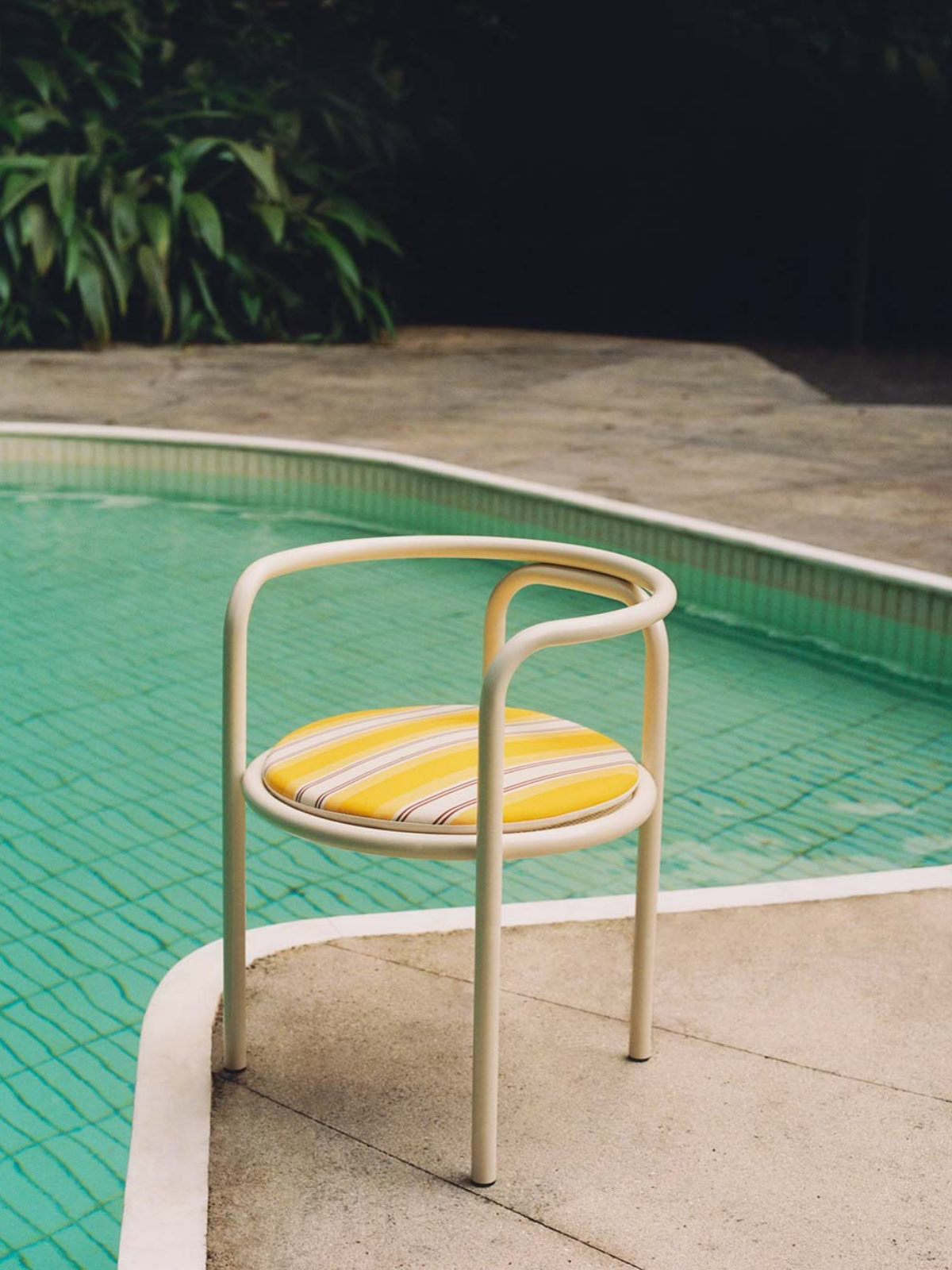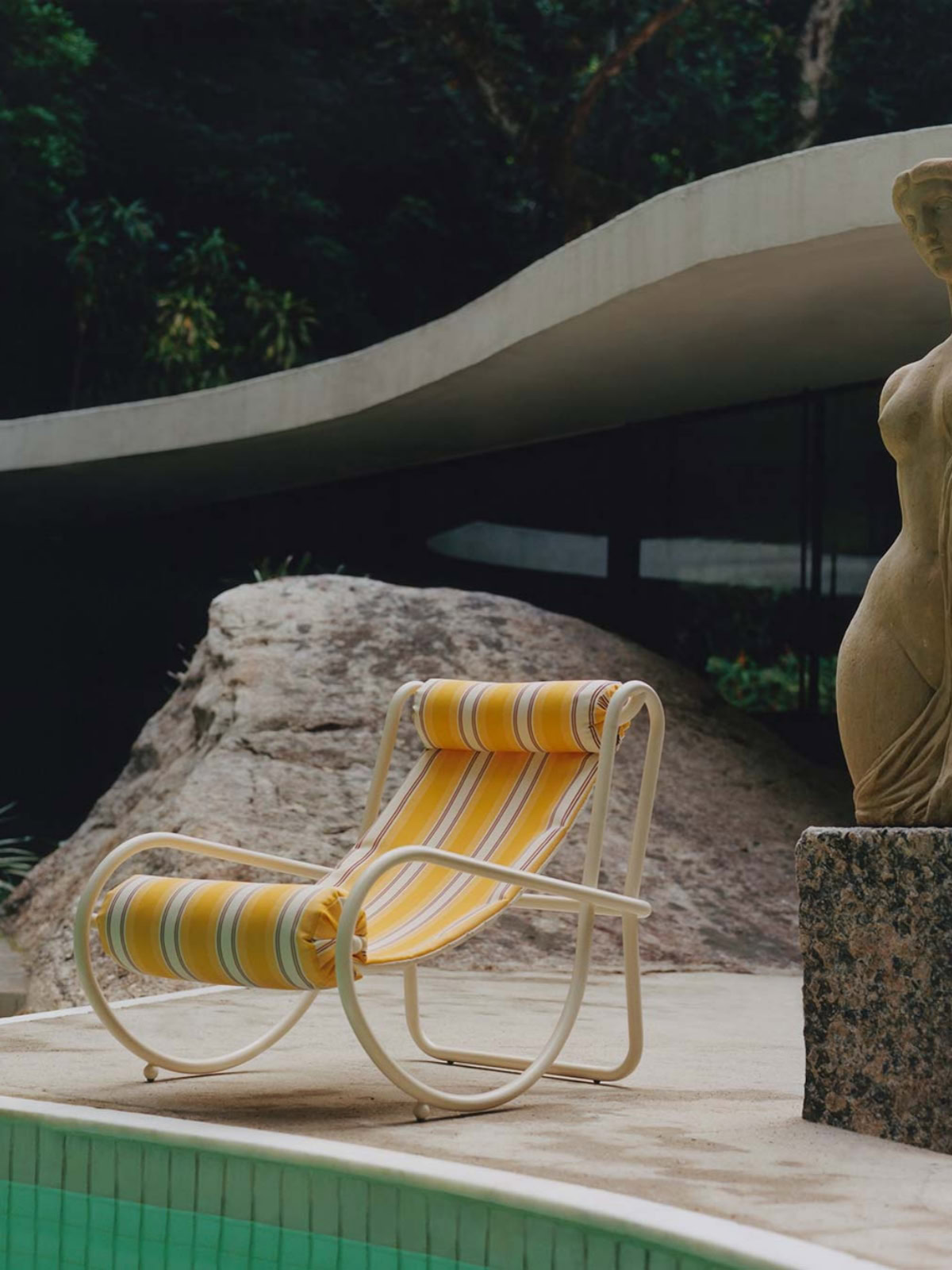 โIโm a great fan of designer chairs and have been collecting Gae Aulentiโs [versions] for many years,โ Jacquemus says, โever since I saw them in the movie La Piscineโ. โI wanted to add a Jacquemus touch to the chair, with a yellow striped fabric inspired by 80s beach mattresses and umbrellas.โ