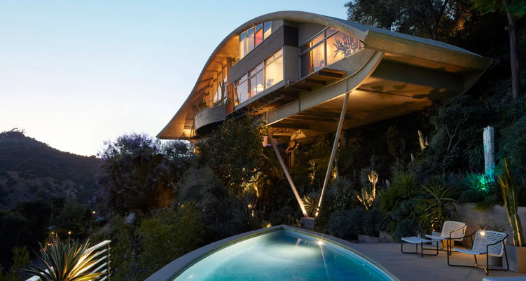 Also known as the Rainbow House, the property at 7436 Mulholland Dr, Los Angeles, was originally designed by John Lautner for the American composer Russell Garcia and is perhaps most well-known from its appearance in Lethal Weapon 2. Lautner trained under Frank Lloyd Wright as a junior architect, a fact that bolsters the stellar reputation of this three-bedroom home that features an almond-shaped parabolic roof, making it instantly recognisable.