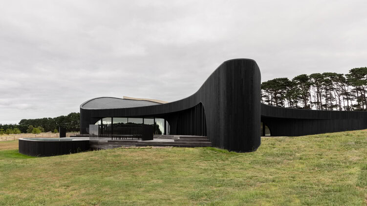 Accessible via a meandering driveway, the main structure resembles a ribbon of rammed earth that crests upwards to as high as 10 metres into the air; wrapping behind the dwelling before gradually tapering into the landscape. And thereโs an actual function to the form.
