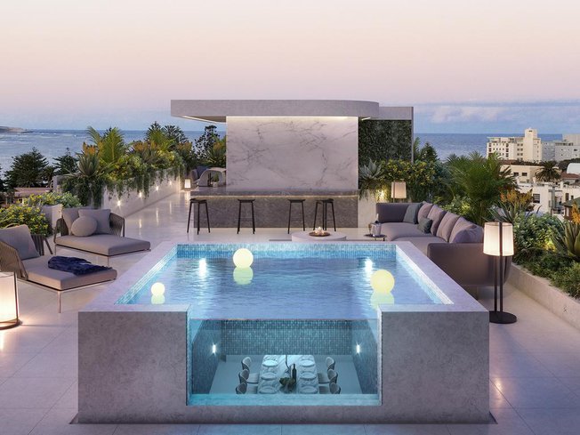 The split-level penthouse apartment exclusively enjoys the sprawling rooftop designed with entertaining in mind. The glass-bottomed pool is perched above the dining room and is paved in honed white marble.