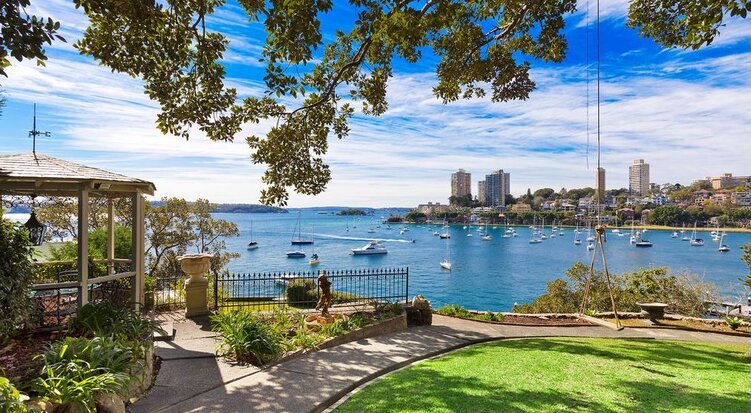Towering heritage-listed Moreton Bay fig trees cast shade over the pristine harbourfront gardens that stretch down to a private sea pool, a jetty and boathouse.
