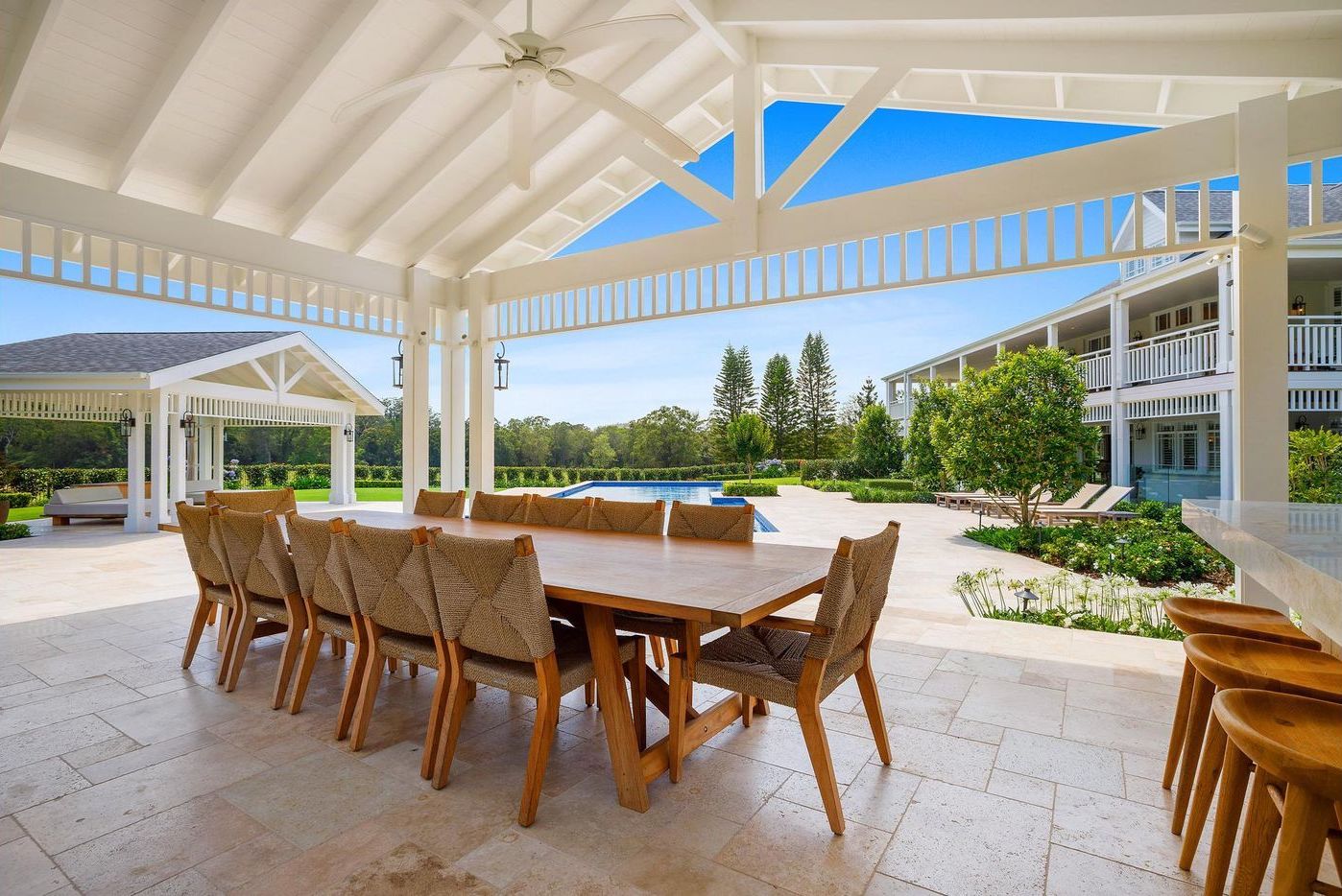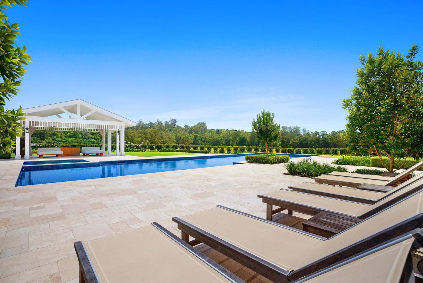 An adjacent three-bedroom pool/guest house with a dedicated entry is separate to the main home, and can be fully self-sufficient.