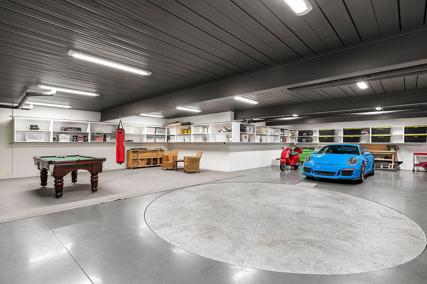 The garage is so cavernous, in fact, that it also doubles as a workshop and rec room where you can store the odd container, fit a billiards table in the corner, hang up a punching bag, all while enjoying a direct view of your Porsche 911 GT3.
