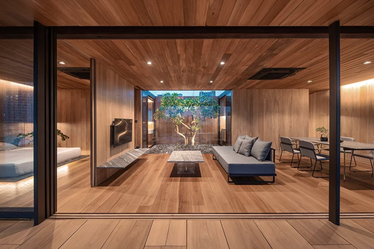 The house itself is a minimalists dream. Divided into a six grid layout, each room is spacious and well lit, creating an openness that flows through the property. The front three sections contain the dining area, living room and bedroom, while the back three grids make up the bathroom, kitchen and a courtyard that can be seen from anywhere in the house.