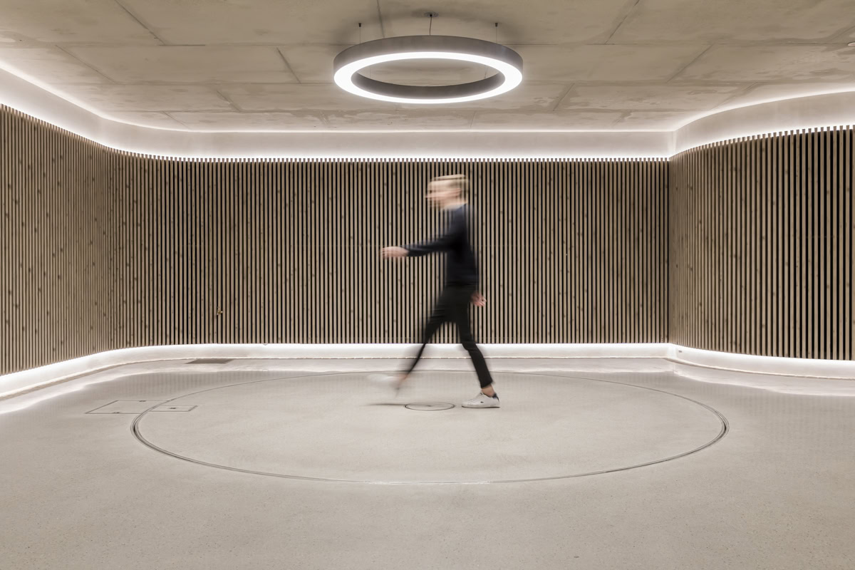 Kent ditched the reflective, glossy surfaces of traditional showrooms and selected LED strip lights to be fitted behind the wall battens at the skirting, to provide a soft glow throughout the entire space. The lighting design highlights the curvature of the walls and lines of the battens, ridding the entire area of its former industrial atmosphere.