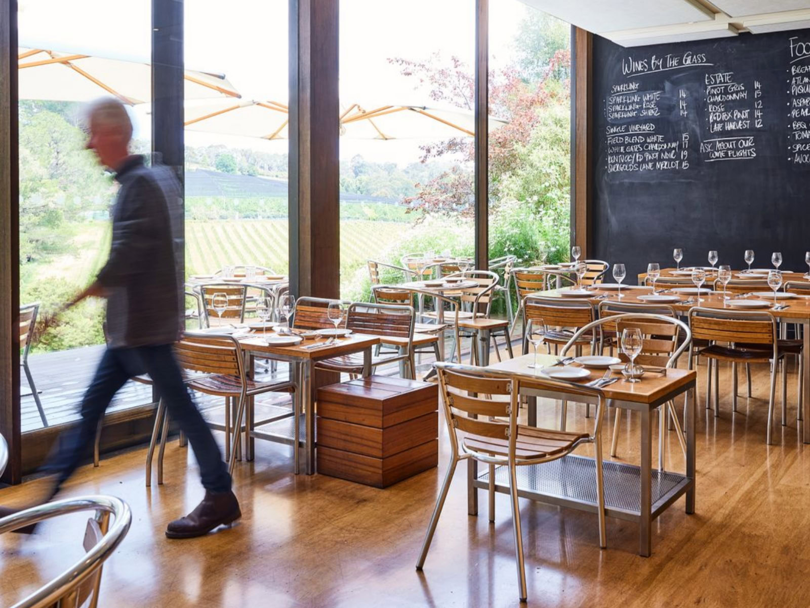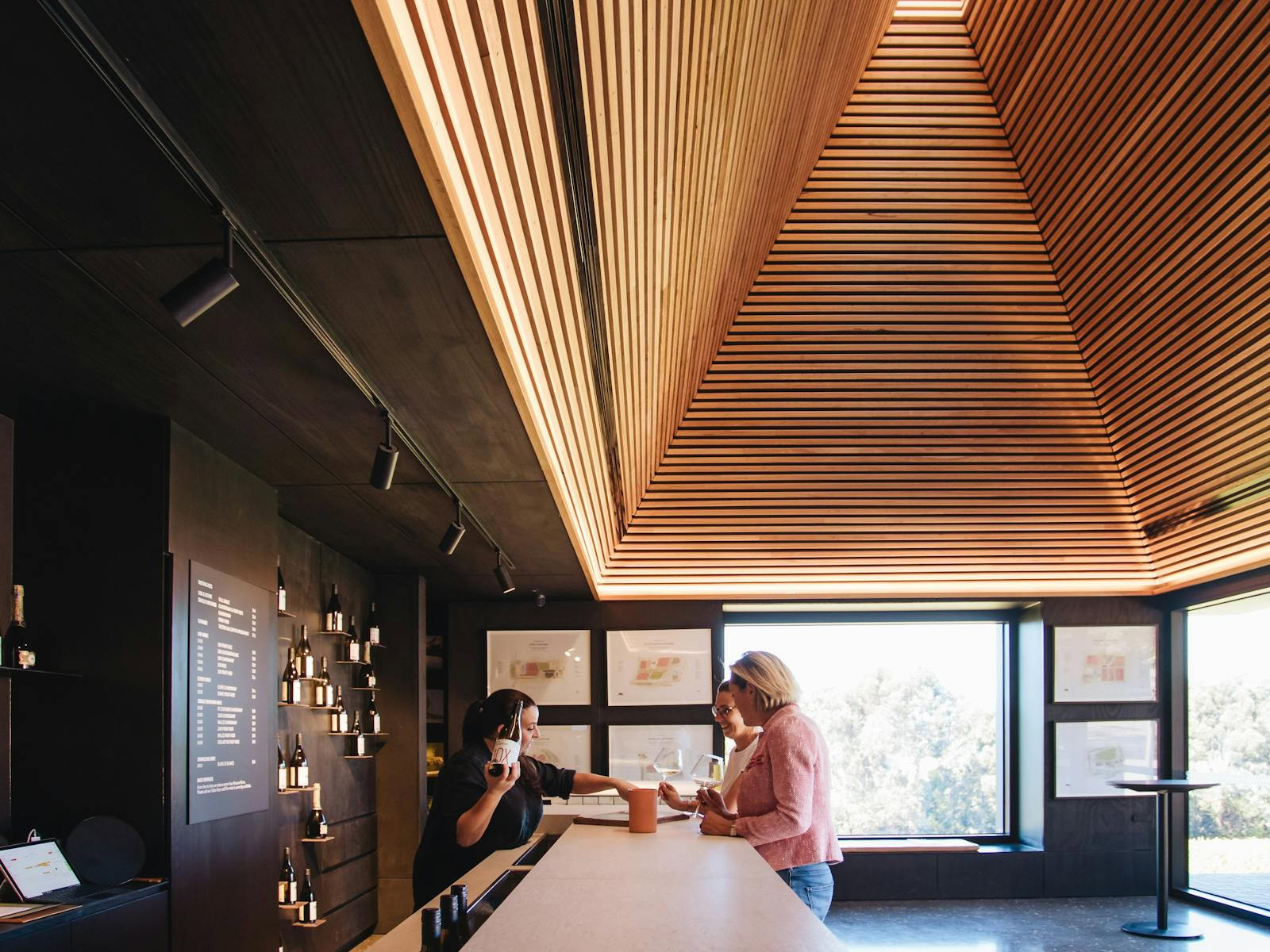 The wineryโs cellar door and signature restaurant are both worthy of a visit: designed by Cox Architecture to heighten visitorsโ connection to the surrounding vineyards.