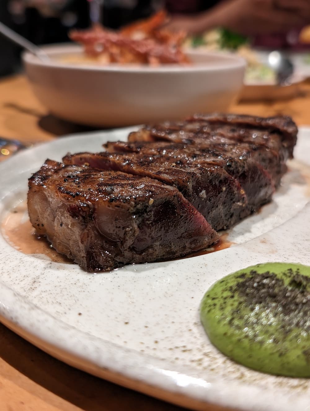 Once the steak arrives, it does so on a plate that looks as if it was custom-designed for partitioned TV dinners of the meat-and-three-veg variety. There’s a space carved out specially for the steak, like a culinary jigsaw puzzle with the main piece already slotted into place. The rest of the plate is completely bare, leaving room for all the shared sides.