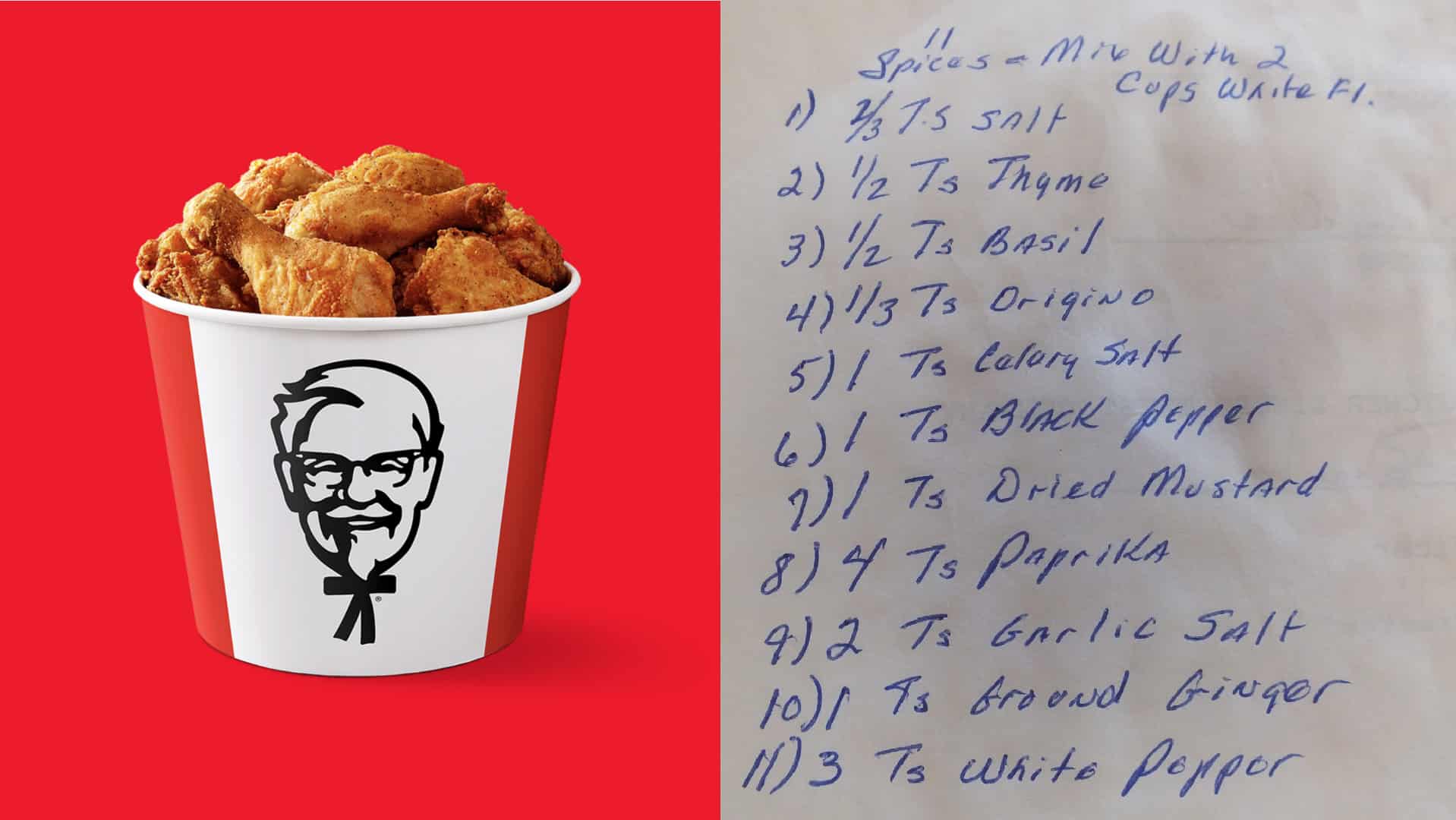 โAt the top of the page, in blue ink, it reads, 11 Spices โ Mix With 2 Cups White Fl. Thatโs followed by an enumerated list of herbs and spices. Eleven herbs and spices. And the measurements for each,โ wrote Jay Jones.