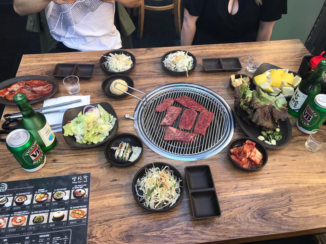 Along with the requisite steamed rice, noodles and slightly spicy kimchi, grab some top-quality beef ribs, bulgogi and marinated pork if you want the standard meal sitting on your table ready for you to cook, charcoal and taste.