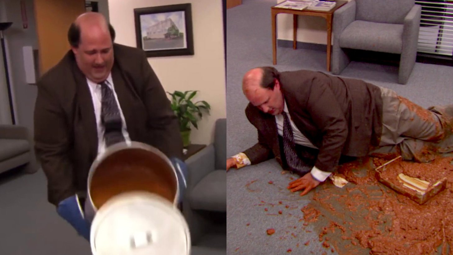 By far the greatest cold open featured in The Office involves Kevinโs Famous Chilli recipe. Portrayed by Brian Baumgartner, the loveable oaf hauls a steaming pot of the good stuff into Dunder Mifflin while breaking down the laborious process behind said pot of chilli via narrationโฆ only to spill the damn thing in disastrous fashion while breaking down on screen.