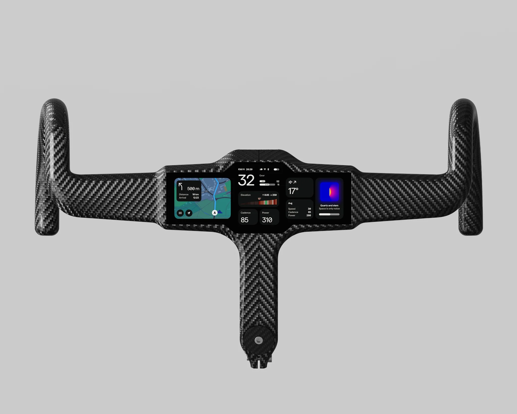 - It features a 180mm by 70mm touchscreen in an integrated carbon fibre road bike handlebar with WiFi, ANT+, Bluetooth, 5G, NFC, GPS, GNSS connectivity and 30 hours of battery life.