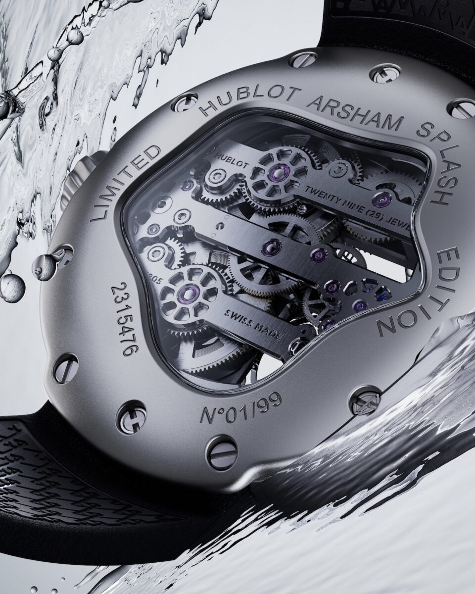 The newly-released watch features a water-inspired sapphire crystal bezel fixed to a lightweight titanium case and paired with a black rubber strap. The movement is another highlight, powered by the HUB1205 with a 240-hour (10-day) power reserve, the balance of which is indicated on the dial.